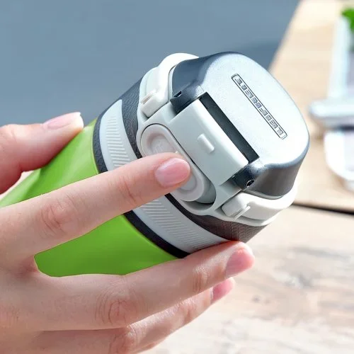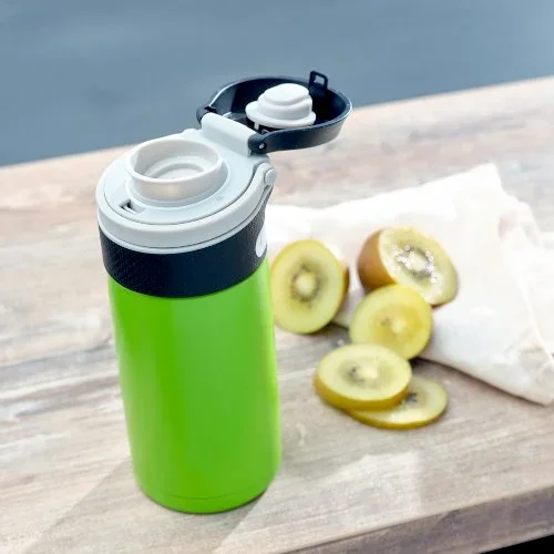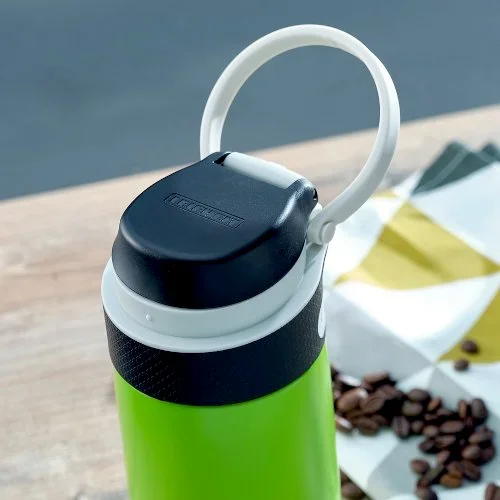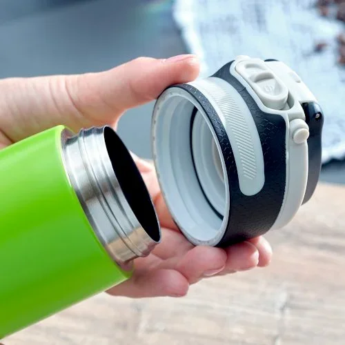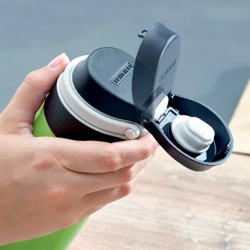 Bardzo praktyczny i niezwykle szczelny kubek termiczny Flip o pojemności 350 ml znakomicie sprawdzi się w podróży, szkole, pracy czy podczas wszelkiego rodzaju aktywności fizycznych. Wyróżnia się doskonałą izolacją termiczną, którą zapewniają podwójne ścianki obudowy wykonanej z wysokiej jakości stali nierdzewnej. Ciepłe napoje zachowują swoją temperaturę do 6 godzin, natomiast chłodne – nawet do 18 godzin. Pokrywka kubka powstała z trwałego i bezpiecznego dla zdrowia tworzywa sztucznego. Jest całkowicie szczelna, antypoślizgowa, posiada zabezpieczenie przed przypadkowym otwarciem i uchwyt do przenoszenia. Całość wygodnie obsługuje się jedną ręką. Pod otworem pokrywki znajduje się wyjmowany filtr, który umożliwia picie napojów z owocami lub ziołami.