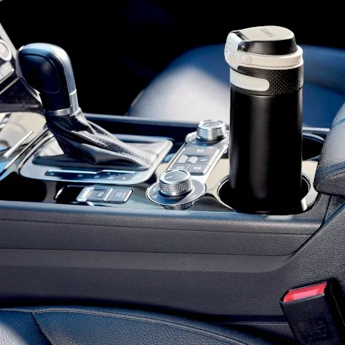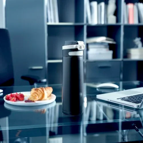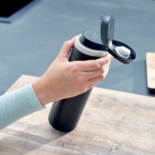 Pokrywka kubka termicznego Flip w kolorze czarnym posiada również praktyczny składany uchwyt, dzięki któremu można kubek komfortowo przenosić. Pod otworem do picia znajduje się odkręcany filtr, umożliwiający mieszanie napojów z kawałkami owoców lub ziół. Dzięki doskonałej izolacji kawa długo będzie ciepła i aromatyczna, a soki wyjątkowo orzeźwiające. Model Flip dostępny jest w kilku innych wersjach kolorystycznych: czarnej, srebrnej, czerwonej, purpurowej, granatowej, błękitnej i kiwi.
