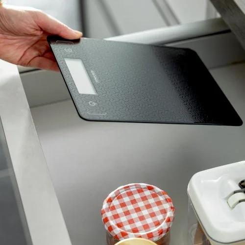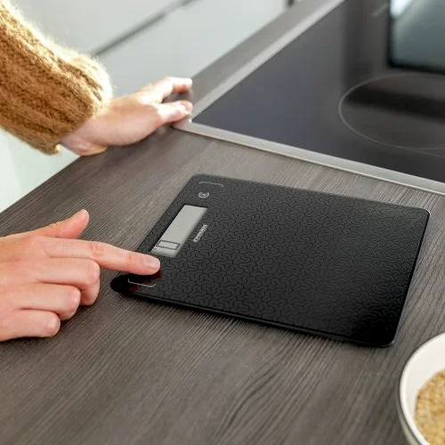 Wagi kuchenne Soehnle Page Comfort Mosaic łączą w sobie bardzo płaską konstrukcję ze stylową, wyczuwalną w dotyku mozaikową teksturą na powierzchni, dzięki czemu przyciągają wzrok w każdej nowoczesnej kuchni. Dzięki wysokości wynoszącej zaledwie 9,9 mm, waga wygodnie mieści się w każdej szufladzie w kuchni. W dolnej części dużej powierzchni ważenia znajduje się 20 mm wyświetlacz LCD, który wyraźnie pokazuje wagę. Przyciski dotykowe po lewej i prawej stronie wyświetlacza umożliwiają intuicyjną obsługę. Waga do żywności mierzy składniki do 10 kg z dokładnością do 1 g i posiada praktyczną funkcję tarowania, która umożliwia ważenie kilku składników w misce jeden po drugim podczas przygotowywania. Po użyciu waga kuchenna Page Comfort Mosaic wyłącza się automatycznie. Antypoślizgowe nóżki zapewniają bezpieczne podparcie.- Wysokiej jakości matowe szkło w ekskluzywnym wzorze mozaiki