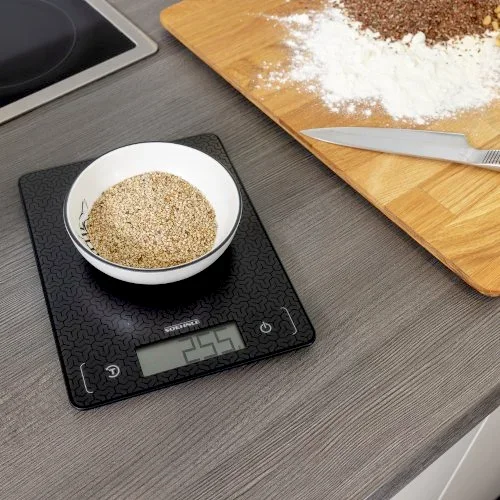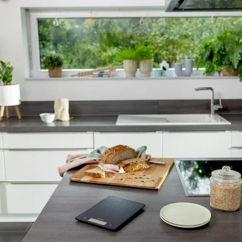 Cyfrowa waga kuchenna Page Comfort Mosaic firmy Soehnle zachwyca ultrapłaską konstrukcją, wyczuwalną w dotyku, wysokiej jakości strukturą mozaiki i łatwym do odczytania wyświetlaczem LCD. Dzięki obsłudze dotykowej, funkcji tarowania i dokładności pomiaru do 1 g, idealnie nadaje się do precyzyjnego ważenia w nowoczesnej kuchni.