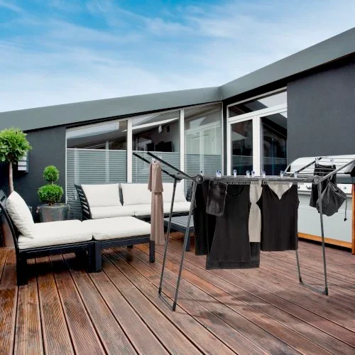 Dzięki eleganckiej czarnej stylizacji suszarka Leifheit przyciąga wzrok, a także pasuje wizualnie do każdego wnętrza.
